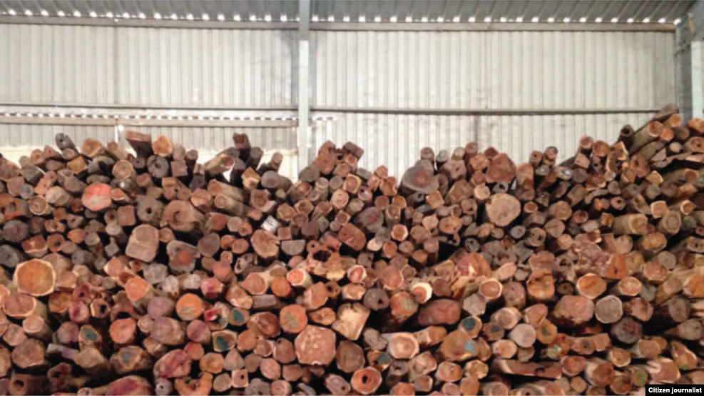 ໄມ້ຜິດກົດໝາຍ ທີ່ທາງການລາວ ຢຶດໄດ້ ຢູ່ໃນສາງແຫ່ງໜຶ່ງ