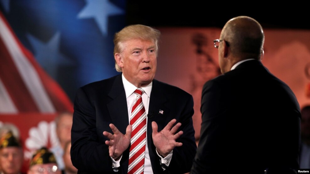 ຜູ້ສະໝັກເປັນປະທານາທິບໍດີສະຫະລັດສັງກັດພັກ Republican ທ່ານ Donald Trump ກ່າວຕໍ່ Matt Lauer ໃນຂະນະກອງປະຊຸມຜູ້ນຳແຫ່ງຊາດ ທີ່ນະຄອນ Manhattan, New York, 7 ກັນຍາ, 2016.